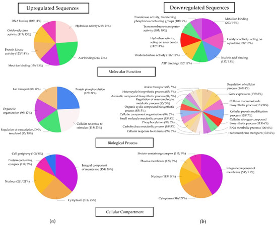 While the study of individual gene expression patterns may allow for identifying specific genes of interest, the classification of groups of functionally related genes may provide a better insight into the overall contribution of a particular set of genes in the studied condition. Therefore, protein domains identified in the DEGs were used in a gene ontology (GO) mapping and functional annotation [50]. Different gene functions were linked to the DEGs, as shown in Figure 7. The GO terms associated with the molecular function, biological process, and cellular compartment of the up- and downregulated sequences are shown in Figure 7a,b, respectively.