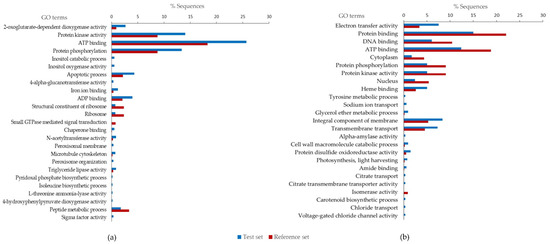 Fisher’s exact test enrichment plots showing the percentage of gene sequences that were enriched in a test set (up- or downregulated genes) against a reference set (annotated list of P. vulgaris genes retrieved from P. vulgaris_442_v2.1 genome). Genes that were upregulated in the slow-cooking bean (Pinto) represented the test set in (a), while the downregulated genes represented the test set in (b). DEGs with a log2 fold change of <−1 and >1 were selected for this analysis. The GO terms were ranked in order of most significantly to least significantly enriched sequences (p < 0.05).