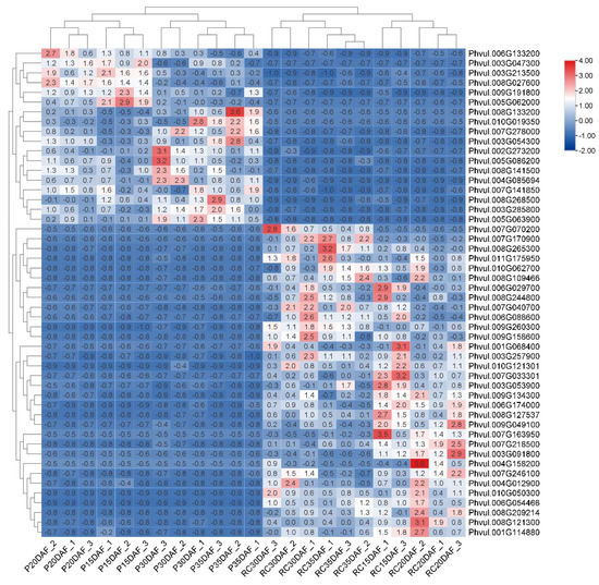 Heat map showing the expression patterns of top 50 DEGs identified between slow-cooking (Pinto) and fast-cooking (Rosecoco) common bean varieties. The gene-expression values used to construct the heat map were normalized using the counts per million (CPM) normalization method, and were further transformed into a logarithmic scale (shown within each cell). Normalized scaling was applied to rows, and the intensity of colour associated with DEGs ranges from red (upregulated genes) to blue (downregulated genes). The gene identifiers (IDs) are shown on the right side of the figure. Significant DEGs with an FDR value of <0.05 were selected to construct the heat map. Average clustering was performed between the rows and columns using Euclidean distance.
