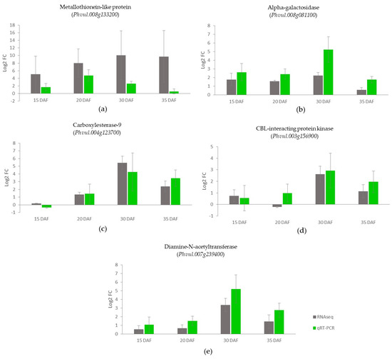 Comparison of RNA sequencing and qRT-PCR methods for analyzing the gene expression in the slow-cooking bean (Pinto) against the fast-cooking bean (Rosecoco). The bar graphs (a–e) show the gene expression of selected highly expressed genes in the slow-cooking bean. Gene-expression values are presented with log2 fold change (Log2FC) normalization. B-tubulin was used as the housekeeping gene for gene-expression normalization [53]. Error bars represent the standard error within samples.