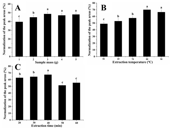 Effect of (A) sample weight, (B) extraction temperature, and (C) extraction time on the extraction efficiency. Different small letters a, b, c in the figure indicate the significant difference between different treatment groups (p < 0.05).
