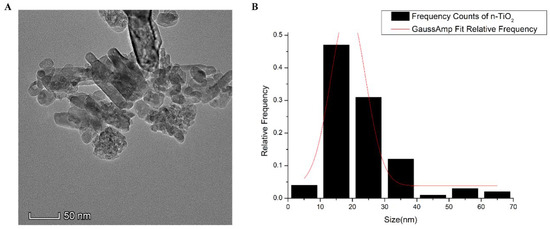 (A) Morphology of TiO2 NPs observed by TEM; (B) size distribution of TiO2 NPs measured by TEM.