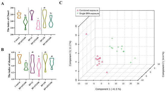 α- and β-diversity of intestinal microbiota. (A) Chao1, (B) Shannon, and (C) PCA score plots of the combined exposure groups (BPA5Ti100 and BPA50Ti100) and the single BPA exposure groups (BPA5 and BPA50). The same letters represent no significant differences among groups (p > 0.05).