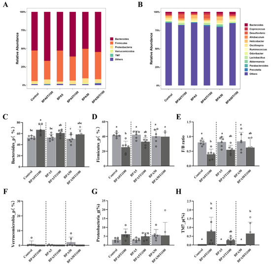Bacteroidetes, Firmicutes, Proteobacteria, Verrucomicrobia, and TM7 were dominant at the phylum level (Figure 3A,C−H). Compared to the control group, the single BPA exposure groups did not experience significant alterations in the dominant bacteria at the phylum level, whereas the BPA0Ti100 group demonstrated a greater impact on Firmicutes and Bacteroidetes, with a 39% decrease in Firmicutes and a 27% increase in Bacteroidetes (p < 0.05) (Figure 3C,D). However, the effect of the combined exposure on the relative abundance of Bacteroidetes and Firmicutes gradually declined as the dose of BPA increased. As a consequence, the effect of combined exposure to BPA and TiO2 NPs on the abundance of major species in the intestine was not significant: a plausible explanation for this phenomenon is that BPA antagonised the effect of the TiO2 NPs.