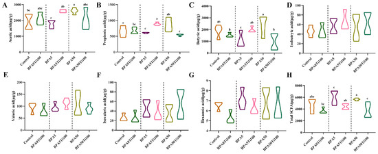 The levels of (A) Acetic acid; (B) Propionic acid; (C) Butyric acid; (D) Isobutyric acid; (E) Valeric acid; (F) Isovaleric acid; (G) Hexanoic acid and (H) Total SCFA. The same letters represent no significant differences among groups (p > 0.05).