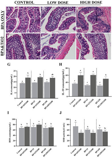 Inflammatory response of TiO2 NPs and BPA. (A–F) Histological characterisation (H&E staining) of the colonic tissue of mice (200×); (G) in-serum IL-6 levels; (H) in-serum IL-10 levels; (I) in-serum ROS levels; (J) in-serum SOD levels. The same letters represent no significant differences among groups (p > 0.05).