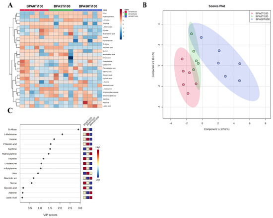 Important discriminatory metabolites were identified by clustering, correlation, and multivariate analysis between the BPA0Ti100, BPA5Ti100, and BPA50Ti100 groups. (A) Hierarchical clustering analysis (HCA) for the metabolites in the three groups based on their z-normalised abundances. (B) PLS-DA 2D score plot displaying the grouped discrimination of the Ti, 5 Ti, and 50 Ti groups by the first two P.C.s. (C) Variable importance in projection (VIP) scores of the important discriminatory metabolites obtained from the PLS-DA models.