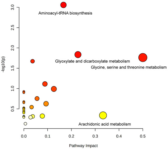 KEGG pathway analysis of differential metabolites between the samples in the BPA0Ti100 and BPA5Ti100 groups. X-Axis represents the Pathway Impact obtained by the out-degree centrality algorithm. The size of the point is related to the Pathway Impact. Y-Axis represents the negative logarithm of the p-value (−log(p)) obtained by the pathway enrichment analysis. The yellow-red color change of the point is positively related to the −log(p). The names of pathways are labeled in the graph with−log(p) > 1 or pathway impact > 0.1.