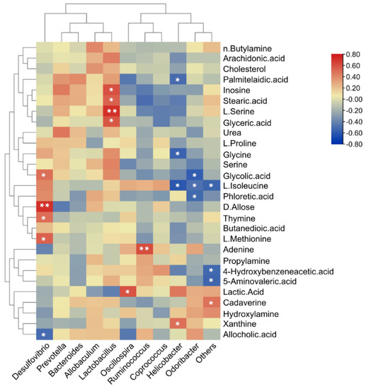 Spearman correlation heatmap analysis between gut microbiota and significant changes in faecal metabolites. p-values computed by Spearman correlation tests (* p < 0.05, ** p < 0.01).