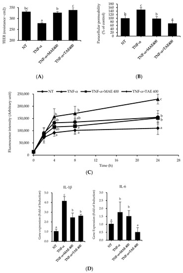 Since the preventive effect of TAE on TNF-α-attenuated TJ function was more potent than that of MAE, the effect of TAE on TJ integrity was scrutinized. Caco-2 monolayers were pre-treated with different TAE concentrations (400, 600, and 800 µg/mL) for 1 h and then incubated with 100 ng/mL TNF-α for 24 h. As illustrated in Figure 2A and B, TAE dose-dependently inhibited the influence of TNF-α on TJ integrity. TEER values of TAE-treated cells at concentrations of 400, 600, and 800 µg/mL followed by TNF-α treatment were 295, 309, and 311 Ω·cm2, respectively, whereas that of TNF-α-treated cells treated was 251 Ω·cm2. Consistent with the TEER values, paracellular permeability in the TNF-α-treated group significantly increased approximately two-fold; however, TAE treatment abolished TNF-α action.