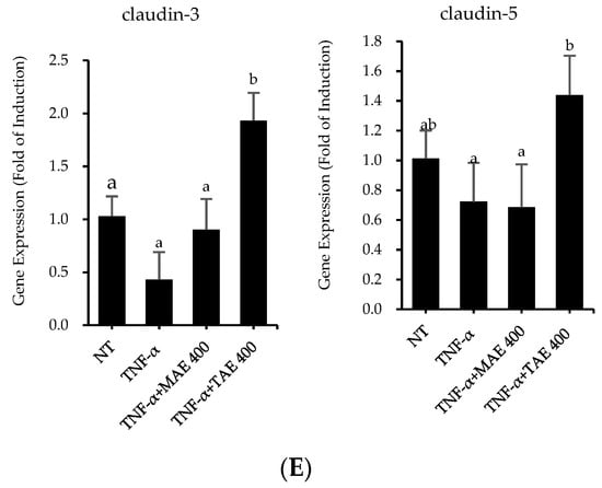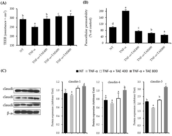 Preventive effects of thinned apple extract (TAE) on tumor necrosis factor-alpha (TNF-α) reduced tight junction integrity in Caco-2 cells. (A) Transepithelial electrical resistance (TEER) and (B) paracellular permeability were measured in TNF-α-treated Caco-2 cells at 24 h incubation. The protective effect of TAE on the protein expression levels of (C) claudin-1, claudin-4, claudin-5, (D) ZO-1, and (E) occludin. Cells were treated with TAE for 1 h and then treated with 100 ng/mL of TNF-α for 24 h. Data are expressed as mean ± SD (n = 6–9). Different letters indicate significant differences by Duncan’s multiple range test (p < 0.05).