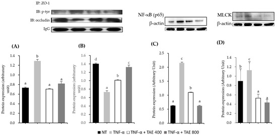 Although TNF-α did not affect ZO-1 and occludin protein levels (Figure 3), they were regulated by its phosphorylation and protein–protein interaction. Thus, we confirmed the effect of TAE on the phosphorylation and interaction of ZO-1 and occludin. TAE at a concentration of 800 µg/mL reduced tyrosine phosphorylation of ZO-1 1.58-fold, compared to that of the TNF-α treatment group (Figure 3A). As a result of the immunoprecipitation assay used to study the interaction between ZO-1 and occludin, the dissociation of ZO-1 with occludin was 1.92-fold in the TNF-α-treated group compared to that in the NT group. However, TAE treatment at 800 µg/mL revealed a 1.81-fold increase in the occludin-ZO-1 complex compared to that of the TNF-α-treated group (Figure 3B). These results indicate that TAE augments TJ integrity, which was reduced by TNF-α-induced ZO-1 protein phosphorylation and the interaction between ZO-1 and occludin.