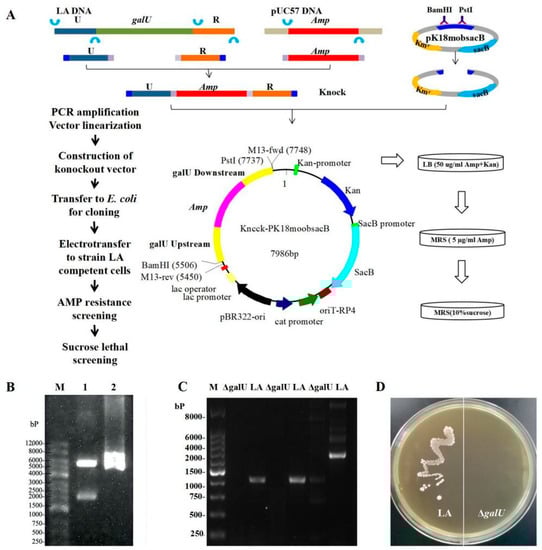 Schematics and results for the knockout of the galU gene. (A) Schematics for the knockout of the galU gene. (B) BamHI-PstI double-digestion map. Lane M, Marker 12,000 bp; Lane 1, fragments of the digested plasmid, Lane2, recombinant plasmid Knock-pK18mobsacB. (C) PCR amplification of the knockout strain ΔgalU and original LA strain. Lane M, Marker 8000 bp; ΔgalU, PCR amplification of the knockout strain ΔgalU; LA, PCR amplification of the original LA strain. (D) The growth of the original strain LA and knockout strain ΔgalU on an M17 plate, with lactose as the sole glycogen. The left side of the plate is the original strain LA, which can form normal colonies. The right side of the plate is the knockout strain, ΔgalU, without colony formation.