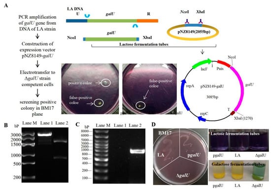 Schematics and results of preparation of the pgalU complementation strain. (A) Schematics for preparation of the overexpression strain, pgalU. (B)Electrophoresis of recombinant expression plasmid pNZ8149-galU. Lane M, Marker 3000 bp; Lane 1, fragments of the digested plasmid; Lane 2, plasmid pNZ8149-galU digested by NcoI-XbaI restriction endonucleases. (C) PCR validation of a positive pgalU strain, screened on a BM17 plate. Lane M, Marker 8000 bp; Lane 1, a pseudo-positive clone; Lane 2, positive pgalU strain. (D) BM17 plate colony (left) and the lactose/galactose fermentation (right) of the LA, ΔgalU, and pgalU strains.