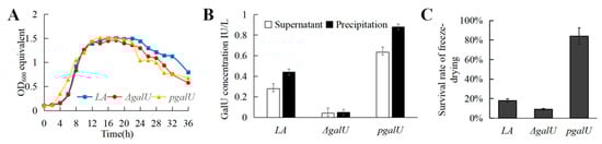 Growth curves, GalU enzyme activity and freeze-drying survival rate for strains LA, ΔgalU and pgalU. (A) Growth curves of strains LA, ΔgalU and pgalU. (B) GalU enzyme activity in strains LA, ΔgalU, and pgalU. (C) The freeze-drying survival rate for strains LA, ΔgalU, and pgalU.