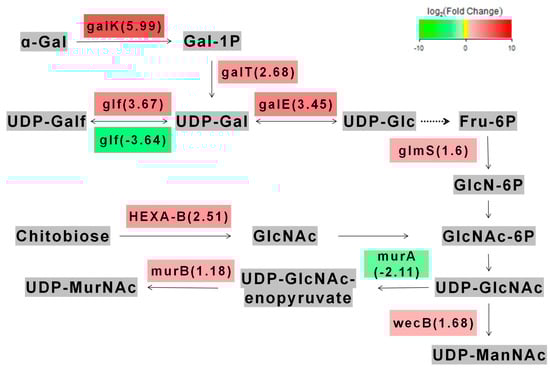 We found that 410 genes were upregulated and 1196 genes were downregulated in the metabolic pathways of L. acidophilus after galU knocked out. In the amino sugar metabolism pathway, we found that the part of the galU genes we edited were mainly involved in the regulation of galactose metabolism (here we only compared the start strain LA with the re-expression strain pgalU, because the knockout strain ΔgalU could not be cultured in lactose) (Figure 5). Through gene enrichment analysis, eight genes with the highest expression difference were identified: galactokinase (galK), UDPglucose--hexose-1-phosphate uridylyltransferase (galT), UDP-glucose 4-epimerase (galE), UDP-galactopyranose mutase (glf), glutamine---fructose-6-phosphate transaminase (glmS), UDP-N-acetylglucosamine 2-epimerase (wecB), UDP-N-acetylmuramate dehydrogenase (murB), hexosaminidase (HEXA_B). Their Q value values were <0.01, and the degree of enrichment was very significant. These genes are related to the transformation of galactose into UDP-ManNAc. This result could be attributed to the recovery of galactose metabolism and improvement of freeze-drying resistance in pgalU.