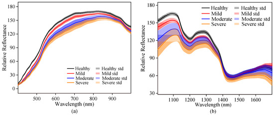 By analyzing the spectral curve characteristics, it can be easily found that the more serious maize mold, the lower the spectral reflection intensity in both wavelength regions, indicating that the light absorption capacity of mold tissue was stronger than that of maize tissue. The spectral curve is monotonous in the Vis-SWNIR region, the average spectral curve gradually increased in the region of 399–820 nm and then decreases slowly. However, the spectral curve was complicated and varied in the LWNIR region. Two obvious reflectance peaks were captured around 1100 nm and 1300 nm, respectively. The former may be related to C-H in lipids [47], and the latter can be designated as a combination between the first overtone of N-H stretching with the fundamental N-H in-plane bending and C-N stretching with N-H in-plane bending vibrations [48]. In addition, there were two obvious absorption peaks at 1192 nm and 1445 nm. The peak at 1192 nm may be associated with the second overtone of C-H stretching in carbohydrates [49] and at 1445 nm may be related to the O-H bond in water and the first overtone of C-H in protein [50]. There were significant differences in the reflectance spectra and texture intensity between different moldy levels. These differences may provide the possibility of classifying the maize with different moldy levels. However, the spectra of maize samples with different moldy levels crossed in some wavelength intervals (1400–1701 nm), and there was no significant correlation between the reflectance spectra and the moldy levels. Hence, the spectra and textures should be fused to research the classification ability of their latent information.