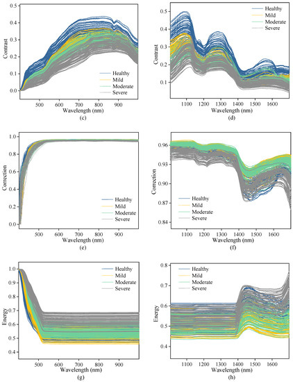 The extraction of texture features was realized by the gray-level co-occurrence matrix (GLCM). The GLCM described the probability of occurrence of two pixels with different distances and directions in a gray image [31]. The data of four texture parameters (contrast, correlation, energy, and homogeneity) in each ROI band was extracted from the GLCM, by Equation (3)–(6). In this study, the pixel distance was set as 1, and only the GLCM in the four directions of 0°, 45°, 90°, and 135° was considered. The average value in the four directions was used to describe each texture parameter characteristic. After removing the noise bands, four texture parameters feature matrices with sizes of 240 × 389 (240: number of samples; 389: number of variables) and 240 × 112 were obtained in the Vis-SWNIR and LWNIR bands, respectively.