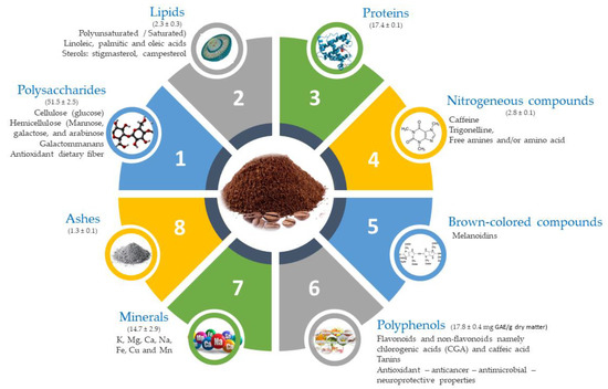 Coffee (Coffea L.), Rubiaceae family, is one of the most popular beverages in the world with over 400 billion cups being consumed each year. A diversity of constituents including chlorogenic acids, pyrazines, furans, alkaloids, melanoidins (Maillard reaction product), among others, are responsible for their organoleptic characteristics. In addition, nutritional and health-promoting constituents including polyphenols (flavonoids, non-flavonoids), carotenoids, triterpenes, and high amounts of stimulant methylxanthine alkaloid, known as caffeine [1], and other molecules with functional properties, are part of coffee composition. As one of the most traded food products in the world after crude oil [2], coffee acts as a major source of income for many countries. In 2020, the International Coffee Organization estimated that coffee production surpassed 169 million 60 kg bags [3], with over 90% taking place in developing nations, namely in South America, while the consumption occurs primarily in industrialized economies. Despite the different flavors and varieties, there are only two types of coffee: (i) Coffea arabica var. Arabica, the most common and flavorful type, accounting for about 70% of world production; and (ii) Coffea canefora var. Robusta, is cheaper with a more aggressive flavor and contains higher amounts of antioxidants, caffeine, and soluble solids. Whereas green coffee is characterized by carbohydrates (60% dry weight), oligosaccharides, disaccharides (sucrose), and monosaccharides, the roasting leads to significant changes in the chemical composition due to the occurrence of the Maillard reaction, carbohydrate caramelization, and pyrolysis of organic compounds (Figure 1). In addition, a plethora of volatile organic metabolites (VOMs), important determinants of odor namely furanic compounds, volatile phenols, pyrazines, and aliphatic aldehydes, are produced and lack sustainable management.