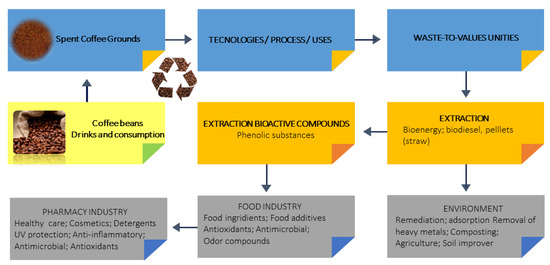 However, these natural low-cost by-products contain high amounts of bioactive components with high antiviral, antidiabetic, antioxidant, and neuroprotective potential [8,9,10]. This evidence, stimulate its exploitation as a renewable and sustainable bio-resource of added-value products with potential several applications, including in the food and pharmaceutical industry, regarding its valorization supported by the circular economy concept, as a powerful platform for shaping the future roadmap in the field of coffee chain sustainability. Moreover, these natural compounds are suitable candidates to replace the synthetic food additives associated with harmful effects on consumers including allergies, cardio- and cerebrovascular diseases and even cancer.