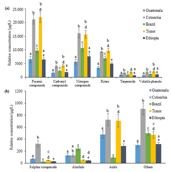 In semi-quantitative terms, furanic compounds (13,150 ± 903.0 μg/L for total relative concentration of volatile fingerprint), nitrogen compounds (11,125 ± 733.3 μg/L), esters (6862 ± 426.5 μg/L), carbonyl compounds (2772 ± 122.3 μg/L), volatile phenols (1310 ± 85.6 μg/L) and terpenoids (1122 ± 89.6 μg/L) were the chemical families with the highest contribution to the volatile fingerprint of spent coffee grounds. The contribution of the remaining chemical families to the total volatile fingerprint was lower than 2%. Figure 3 shows the distribution of the VOMs, according to chemical family. Significant statistical differences were observed (Figure 3) in terms of relative concentration among chemical families identified in spent coffee grounds from different coffee investigated samples.