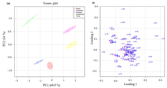 The one-way ANOVA with post-hoc Tukey test (p < 0.05) performed showed that, the p values obtained proved that the identified 111 VOMs presented statistically significant differences for the analyzed spent coffee grounds from different geographical origins. Statistical analysis was applied to the spent coffee grounds through the principal component analysis (PCA) multivariate pattern recognition procedure, to determine the differences in the volatile fingerprint. Figure 4a,b present the PCA score plot and loading plot from the spent coffee grounds from different geographical origins, respectively. All spent coffee grounds were adequately separated, underlining that the total 111 VOMs identified in the five different samples allowed their discrimination.