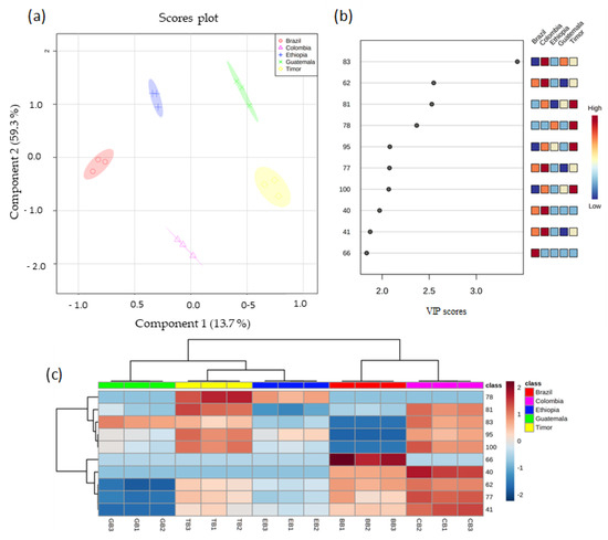 The heatmap created using Pearson’s correlation for the VOMs with VIP scores > 1.5 is shown in Figure 5c. The heatmap shows that most of these VOMs presented higher chromatographic area in Colombia spent coffee grounds, except for 2-acetylpyridine (78) and benzofuran (66), that presented higher values in Timor and Brazil spent coffee grounds, respectively. In addition, as seen in Figure 5c, the volatile fingerprint of spent coffee grounds showed remarkable differences among the geographical regions. This variance could be an outcome of climate conditions factors (e.g., mean annual temperature), altitude and geographic location (e.g., longitude, latitude), which may result in an inhibition of the activity of certain odor-related enzymes [38,39].