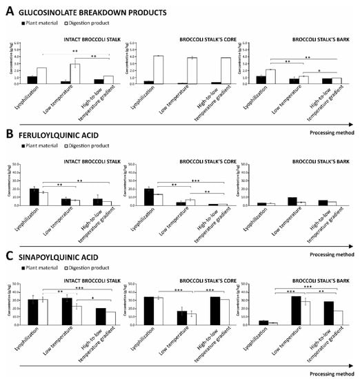 Content of glucosinolates breakdown products (A), feruloylquinic acids (B), and sinapoylquinic acids (C) of in vitro gastrointestinal digestion products of lyophilized, low-temperature dried, and high-to-low temperature gradient dried broccoli stalks and co-products. Significant differences were according to a paired t-test (p < 0.05 (*), p < 0.01 (**), and p < 0.001 (***)).