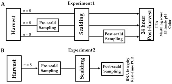 All experimental procedures were reviewed and approved by the Auburn University Institutional Animal Care and Use Committee (IACUC; approval number: PRN 2012-2122). The Auburn University College of Agriculture is further accredited by the Association for Assessment and Accreditation of Laboratory Animal Care International (AALAC) and this study was conducted in accordance with the Federation of Animal Science Societies’ Guide for the Care and Use of Agricultural Animals in Research and Teaching. Purebred Yorkshire pigs (Sus domesticus; n = 32), sourced from the resident herd at the Auburn University Swine Research and Education Center (SREC), were reared according to typical industry practices to a body weight of 121.3 ± 3.6 kg. Figure 1 depicts the experimental design. Experiment 1 was conducted to determine the effects of timing of tissue sampling, i.e., pre-scalding versus post-scalding on indices of meat quality. To accomplish this aim, 24 pigs were reared to their target weights and then humanely harvested at the Auburn University Lambert Powell Meats Laboratory under inspection. Carcasses were randomly assigned to one of three groups: (1) a control group in which no tissue was sampled from the carcass, (2) a pre-scald group in which tissue was sampled from the carcass above the tenth rib on the right side immediately following exsanguination, and (3) a post-scald group in which tissue was sampled from the carcass above the tenth rib on the right side immediately following scalding/dehairing (5 min at 65 °C). Carcasses were then further processed as normal and pork quality measures were taken at the tenth rib on the right side of the chilled carcasses at 24 h post-harvest, as described below, to compare the impact that exposing the underlying tissue to scalding and air might have on the estimates of color.