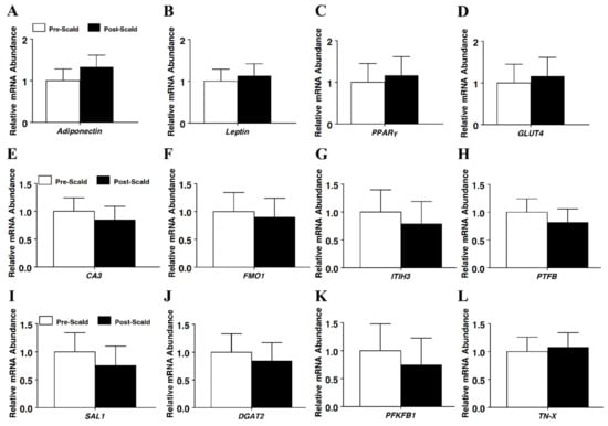 The effect of scalding on mRNA expression in subcutaneous adipose tissue of market weight hogs, as determined using real-time RT-PCR for genes (A) adiponectin, (B) leptin, (C) peroxisome proliferator-activated receptor gamma (PPARγ), (D) glucose transporter 4 (GLUT4), (E) carbonic anhydrase III (CA3), (F) flavin-containing monooxygenase 1 (FMO1), (G) inter-alpha (globulin) inhibitor H3 (ITIH3), (H) 6-phosphofructo-2-kinase/fructose-2,6-biphosphatase 1 (PFKFB1), (I) salivary lipocalin (SAL1), (J) diacylglycerol O-acyltransferase 2 (DGAT2), (K) pleiotropic factor beta (PTFβ), and (L) tenascin-X (TN-X). Values were normalized to S15 mRNA abundance and expressed as a fold change relative to pre-scald samples and calculated according to Pfaffl (2010). Bars denoted by differ (p < 0.05); pre-scald, n = 8; post-scald, n = 8.