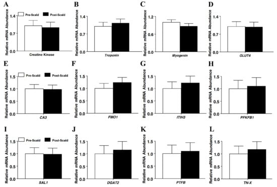 The effect of scalding on mRNA expression in the longissimus dorsi muscle of market weight hogs, as measured using real-time RT-PCR for genes (A) creatine kinase, (B) troponin, (C) myogenin, (D) glucose transporter 4 (GLUT4), (E) carbonic anhydrase III (CA3), (F) flavin-containing monooxygenase 1 (FMO1), (G) inter-alpha (globulin) inhibitor H3 (ITIH3), (H) 6-phosphofructo-2-kinase/fructose-2,6-biphosphatase 1 (PFKFB1), (I) salivary lipocalin (SAL1), (J) diacylglycerol O-acyltransferase 2 (DGAT2), (K) pleiotropic factor beta (PTFβ), and (L) tenascin-X (TN-X). Values were normalized to S15 expression. Data are normalized to S15 mRNA abundance and expressed as a fold change relative to pre-scald samples and calculated according to Pfaffl (2010). Bars denoted by differ (p < 0.05); pre-scald, n = 8; post-scald, n = 8.