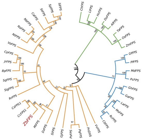 Results of phylogenetic analysis of ZbFPS and other plants. The numbers in the figure represent the genetic distance. Bootstrap values are shown as a percentage of 1000 replicates. Different colors represent different clades. ZbFPS is marked by green dots. The GeneBank sequence number of the related sequence: Citrus sinensis CsFPS1 (XM_025097884.1); Citrus clementina CcFPS1 (XM_006452594.2); Mangifera indica MiFPS (JN035296.1); Betula platyphylla BpFPS (KP729177.1); Panax notoginseng PnFPS (DQ059550.1); Durio zibethinus DzFPS (XM_022898165.1); Vitis vinifera VvFPS (NM_001280935.1); Cyclocarya paliurus CpFPS (GU121224.1); Siraitia grosvenorii SgFPS (KJ139983.1); Valeriana officinalis VoFPS (KP735611.1); Chlorophytum borivilianum CbFPS (KM272205.1); Chimonanthus praecox ChFPS (FJ415102.1); Lilium longiflorum LlFPS (JF273657.1); Juglans regia JrFPS (XM_018957967.1); Medicago sativa MsFPS (GU361537.1); Ricinus communis RcFPS (KT306005.1); Pyrus communis PcFPS (KF855953.1); Malus domestica MdFPS (NM_001293873.1); Paeonia lactiflora PlFPS (KP708571.1); Nicotiana tabacum NtFPS (XM_016630722.1); Nicotiana benthamiana NbFPS (LC015753.1); Nicotiana sylvestris NsFPS (XM_009766390.1); Solanum tuberosum StFPS (XM_006344841.2); Solanum lycopersicum SlFPS (NM_001247139.2); Solanum pennellii SpFPS (XM_015206329.1); Capsicum annuum CaFPS (NM_001324870.1); Panax sokpayensis PsFPS (KT936527.1); Panax quinquefolius PqFPS (KC524468.1); Sesamum indicum SiFPS (XM_011099429.1); Zea mays ZmFPS (NM_001111569.1); Lupinus albus LaFPS (U15777.1); Gossypium arboreum GaFPS (NM_001330011.1); Oryza sativa OsFPS (D85317.1); Anoectochilus formosanus AfFPS (MH104946.1); Gardenia jasminoides GjFPS (MG811940.1); Gossypium hirsutum GhFPS (NM_001326961.1); Rosa rugosa RrFPS (KP768082.1); Triticum aestivum TaFPS (JX235717.1); Hedychium coccineum HcFPS (JN695015.1); Dendrobium officinale DoFPS (JX679465.1); Gentiana lutea GlFPS (EF203252.1); Siraitia grosvenorii SigFPS (KJ139983.1).