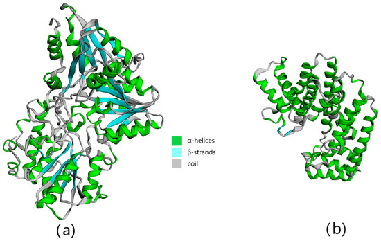 Under the influence of evolutionary forces, proteins form a 3D structure to meet specific functional needs. Therefore, understanding the tertiary structure of a protein can help us understand its function. However, it is time-consuming and laborious to determine the tertiary structure of the protein through experiments, and building a model through a computer can make it easier for us to understand the properties of the protein [28]. The predicted tertiary structures of ZbDXS and ZbFPS are shown in Figure 2. Human DXS with 41.34% sequence identity served as a template for comparative modeling. The GMQE (Global Model Quality Estimation) was >0.63 (Table S3), and the QMEAN (Qualitative Model Energy ANalysis) was>−3.04 (Table S5). The 3D model for ZbFPS was established based on the template of human FPS (82.06% sequence identity). The GMQE was >0.96, indicating the high quality of the result, and the QMEAN was >−0.06 (Table S3). The predicted structures of ZbDXS and ZbFPS consisting predominantly of alpha-helices were folded as a single domain.