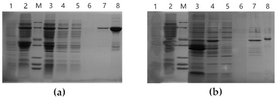 Analysis of expressed fusion proteins containing ZbDXS (a) and ZbFPS (b). Lane 1: uninduced; Lane 2: total proteins from IPTG-induced; Lane M: protein marker; Lane 3: proteins from the sediment; Lane 4: proteins from the supernatant; Lane 5: proteins from the flow-through; Lane 6: proteins from the first elution; Lane 7: proteins from the second elution; Lane 8: Concentrated protein.