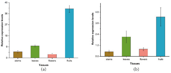 To investigate the expression patterns of ZbDXS and ZbFPS, the Z. bungeanum tissue-specific expression pattern was assessed (Figure 5). RT-qPCR analysis showed that two genes had different expression patterns in different tissues of Z. bungeanum. In general, both genes were expressed in all tissues. ZbDXS had the highest relative expression in fruits, followed by leaves, stems, and flowers; ZbFPS had the highest relative expression in fruits, followed by leaves and flowers, and the lowest relative expression in stems (Table S4). It was noteworthy that both genes were highly expressed in the fruit, which may be related to the relatively high level of terpene accumulation in the fruit, which required further study.