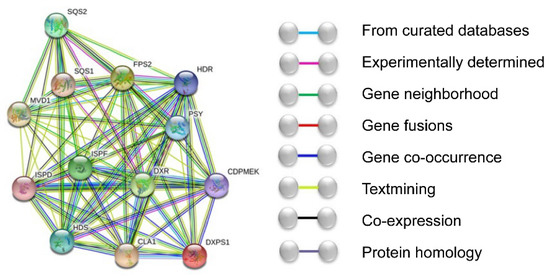 When plants are under stress, the terpenes pathway responds to environmental factors to stress resistance, thereby protecting plants [16]. The interaction of upstream and downstream genes in the terpene pathway forms a feedback regulation mechanism, the core of coping with stress. The interactions of ZbDXS and ZbFPS with other regulatory proteins were predicted by STRING (http://string-db.org/) (accessed on 29 May 2020). Input ZbDXS and ZbFPS into the STRING website to predict protein interactions. The specie selection was the Arabidopsis thaliana for analysis. Among them, ZbDXS matches DXPS1 (73%), and ZbFPS matches FPS2 (80%). We can find from the protein functional connection network that ZbDXS and ZbFPS have complex interactions with various proteins (Figure 6). These proteins are involved in the terpene pathway, where ISPF and DXR are at the center of the functional connection network and interact with various proteins. The results showed that genes in the terpene pathway interact with each other, antagonizing each other and producing terpenes in response to stress response.