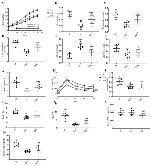 The body weight of rats in the M group started to be significantly higher than that of the Con group on the 14th day of the intervention and RPE prevented the increased body weight in the M group (Figure 1A). Liver weight was also decreased by RPE (Figure 1B). Plasma parameters demonstrated the abnormal lipid metabolism, glucose metabolism, and immune responses in the M group. Compared to the Con group, the M group demonstrated higher levels of LDL, total cholesterol, and triglyceride (Figure 1C,D,F). HDL level was lower in the M group compared to the Con group (Figure 1E). Fasting blood glucose, the glucose level in the OGTT test, hemoglobin A1c (HbA1c), insulin, and HOMA-IR levels were higher in the M group compared to the Con group (Figure 1G–K). The plasma IL-β level was higher in the M group compared to the Con group (Figure 1M). No difference was observed in TNF-α between the M and Con groups (Figure 1L). Administration of RPE significantly decreased fasting blood glucose, HbA1c, insulin, HOMA-IR, LDL, total cholesterol, triglyceride, plasma IL-β, and plasma TNF-α levels and increased the HDL level as well as improved glucose intolerance.