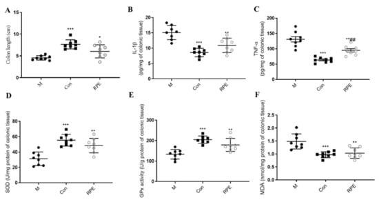 Colon length was longer in the Con group compared to the M group, whereas, RPE could prevent the decrease in the colon length in diabetes (Figure 2A). STZ- and high-fat diet-induced diabetes also demonstrated abnormal immune responses in the colon with the increased levels of colonic IL-β and TNF-α and the RPE decreasing these parameters (Figure 1B,C). Colonic oxidative stress markers were evaluated, superoxide dismutase (SOD), glutathione peroxidase (GPx), and malondialdehyde (MDA) were significantly altered in the M group compared to the Con group and RPE significantly reversed these oxidative stress markers to the normal levels (Figure 1D,E).