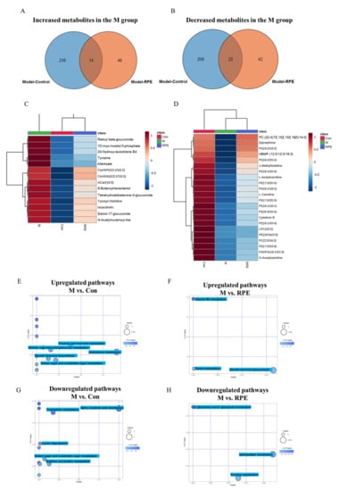 Venn diagrams showing the number of increased metabolites in the M group compared to the Con groups were decreased by RPE (A) and the number of decreased metabolites in the M group compared to the Con groups were increased by RPE (B). Increased metabolites in diabetes that were reversed by RPE (C). Decreased metabolites in diabetes that were reversed by RPE (D). KEGG pathway enrichment analysis based on increased metabolites in M/Con (E) and M/RPE (F) comparisons. KEGG pathway enrichment analysis based on decreased metabolites in M/Con (G) and M/RPE (H) comparisons.