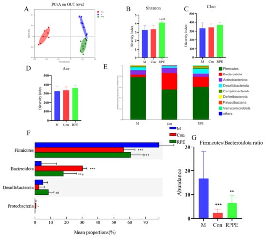 PCoA plot of gut microbiota at genus level (A). Shannon index (B). Chao index (C). Ace index (D). The components (E) and comparisons (F) of gut microbiota at phylum level. Firmicutes/Bacteroidota ratio (G) Note: * p < 0.05, ** p < 0.01, and *** p < 0.001 versus the M group; # p < 0.05, ## p < 0.01, and vs. the Con group.