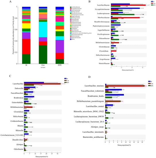 Effects of Rosa roxburghii fruit polyphenols extract on gut microbiota at family (A,B), genus (C), and species (D) level. Note: * p < 0.05, ** p < 0.01, and *** p < 0.001 versus the M group; # p < 0.05, ## p < 0.01, and ### p < 0.001 versus the Con group.