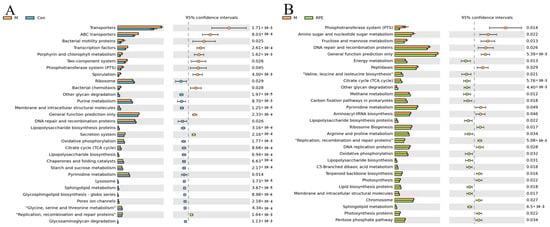 Function prediction of the gut microbiota revealed by PICRUSt2. M group versus Con group (A) or RPE group (B). Note: p < 0.05, confidence intervals = 95%.