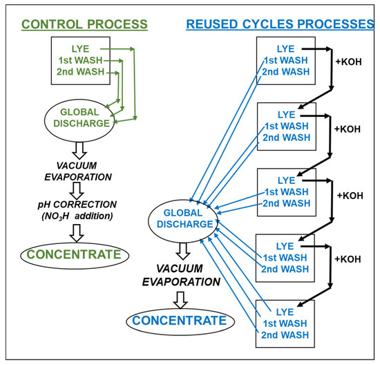 The lyes and washing waters of two tanks (replicates) from one oxidation process (Control) were stored at 5–7 °C for further vacuum evaporation (Figure 1).