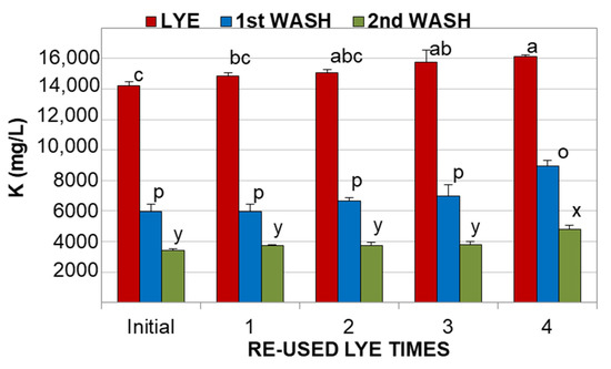 Potassium concentration in lyes and washing waters. Different letters on the bars for each solution (a, b, c for lye; p and o for 1st washing; x and y for 2nd washing) means significant differences according to Duncan’s multiple range test (p < 0.05).