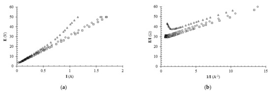 Figure 2a shows the results of the limiting current tests. The voltage applied to the stack showed a linear trend for low values of the current. For higher values, the voltage deviated from the line approximating the first linear zone, and this deviation occurred for lower current values the lower the concentration (or corresponding conductivity) of the solution. This behavior is consistent with previous results obtained using strong electrolytes [16,17] or the sodium salts of monoprotic, diprotic and poliprotic acids [18,19,20,21,22]. To facilitate the determination of the limiting current, the experimental voltage-current data were plotted on a Cowan and Brown diagram (Figure 2b).