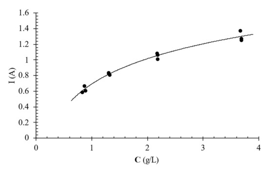 For each data set on Figure 2b, the abscissa of the minimum point was determined from which the limiting current was calculated. The values thus determined are shown as a function of acid concentration in Figure 3. The maximum Ilim value determined was 1.3 A at a concentration value of 3.7 g/L. For higher acid concentration values, it was not possible to find the limiting current intensity because the corresponding data did not show a relative minimum point on the Cowan and Brown diagram. However, it can be stated that the limiting current for higher concentrations is definitely greater than 1.3 A. Since the acid concentration did not drop to values below 3.7 g/L during the desalination tests, currents lower than 1.3 A were applied in the range of 0.5–1 A as a precaution.