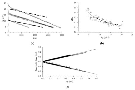 Deacidification experiments of citric acid solutions at different electric current intensities (I = 0.5 A, open symbols; I = 1 A, closed symbols; I = 0.75 A, x, +, ) and initial concentrations (CD0 = 25 g/L, ▲, ∆; CD0 = 12.5 g/L, ◆, ◊; CD0 = 18.75 g/L, x, +, ): (a) citric acid concentration (CD) vs. time (t); (b) pH vs. citric acid concentration (CD); (c) variation in the number of moles of citric acid or titratable acidity for the diluting (∆nBD) and concentrating (∆nBC) tank vs. the number of moles of elemental charge (nF) (symbols ○ and □ refer to pineapple fruit juice and to pineapple fruit juice enriched with citric acid, respectively). Symbols refer to experimental data while the continuous lines refer to approximating curves.