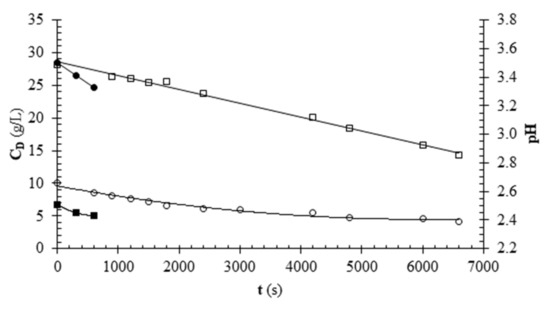 Time course of pH (●, ○) and titratable acidity concentration (CD) (∎, □) for the deacidification of pineapple juice carried out at I = 0.75 A as such (closed symbols) or at I = 1 A enriched with approximately 20 g/L of citric acid (open symbols).
