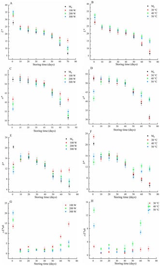 Effect of microwave power and temperature on L*, a*, b*, and ΔE*ab of red wine during storage. (A) L* value at different microwave power; (B) L* value at different microwave temperature; (C) a* value at different microwave power; (D) a* value at different microwave temperature; (E) b* value at different microwave power; (F) b* value at different microwave temperature; (G) ΔE*ab value at different microwave power; (H) ΔE*ab value at different microwave temperature.