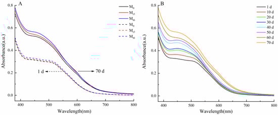 (A) Visible spectra of red wine samples on the first day and 70th day of storage. (B) Visible spectra of Mt6 sample on the first, 10th, 20th, 30th, 40th, 50th, 60th, and 70th days of storage.